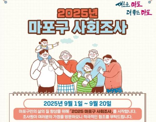 마포구(구청장 박강수)는 구민의 주거·복지 등 생활 실태와 정책 수요를 체계적으로 조사·분석해, 향후 구정 운영의 기초자료로 활용하기 위한 '2025년 마포구 사회조사'를 오는 9월 1일부터 20일까지 실시한다.