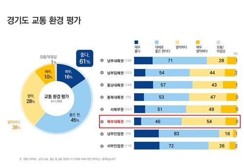 현재 교통환경에 대해서는 응답자의 61%가 '좋다'고 평가했으며, 최근 3년간 교통환경이 '좋아졌다'고 응답한 비율은 76%에 달했다. 특히 북부내륙권(의정부·양주·동두천·포천·연천)의 경우 현재 만족도는 46%로 상대적으로 낮았지만, 최근 3년간 교통환경이 개선됐다는 응답이 86%로 높게 나타나 도민들이 정책 효과를 체감하고 있는 것으로 분석됐다.