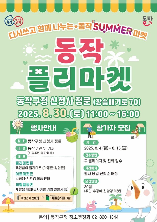 동작 플리마켓 홍보 포스터.이번 플리마켓은 재활용 문화 확산과 자원순환 생활화에 기여하고자 마련됐으며, 행사장은 플리마켓존, 아트마켓존, 체험활동존으로 나뉜다.