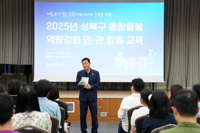 '2025년 성북구 통합돌봄 역량강화 민관합동 교육'에 참석한 이승로 성북구청장.성북구(구청장 이승로)는 지난 8월 12일과 19일 양일간 성북구청 4층 성북아트홀에서 ‘의료·요양·돌봄 통합지원 체계 구축을 위한 2025년 성북구 통합돌봄 역량강화 민관합동 교육’을 개최했다고 밝혔다.