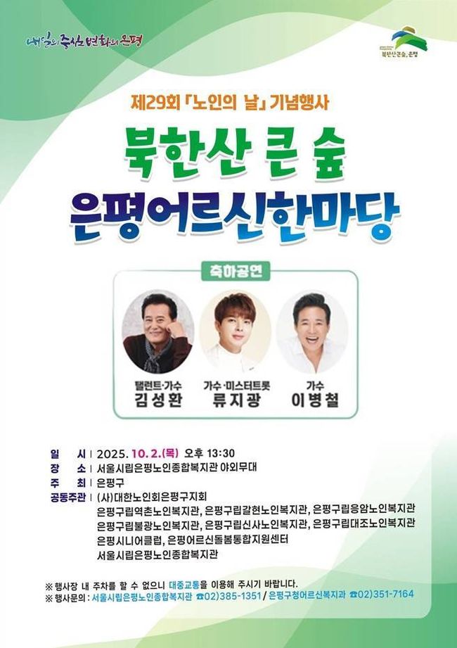 더불어 탤런트 겸 가수 김성환, 가수 류지광, 이병철이 무대에 올라 축하공연을 선보이며 어르신들에게 다채롭고 즐거운 시간을 선사할 예정이다.