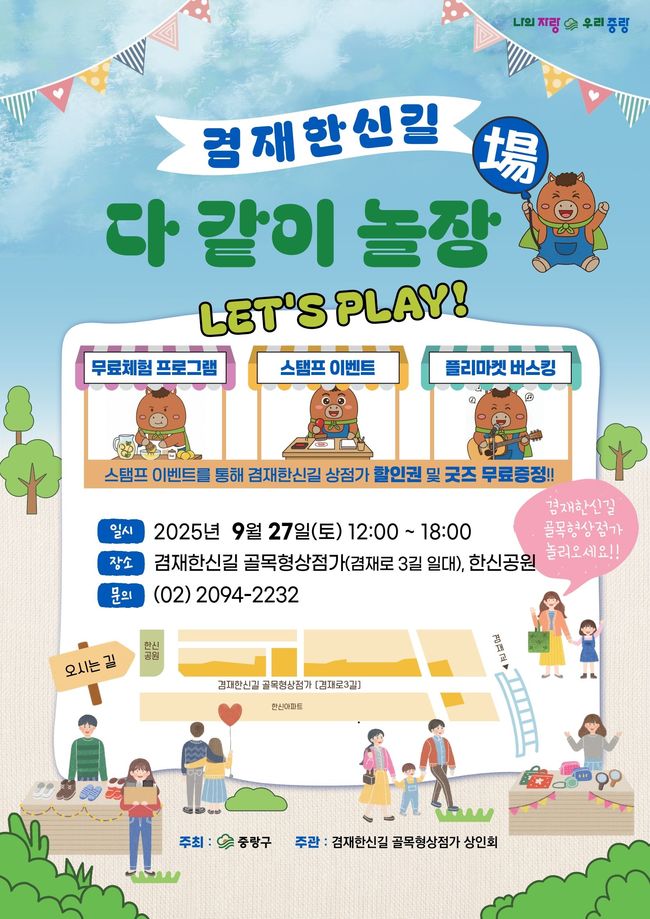 중랑구(구청장 류경기)는 지역 상인과 주민이 함께 꾸미는 ‘겸재한신길 다 같이 놀장(場)’ 축제를 개최한다.