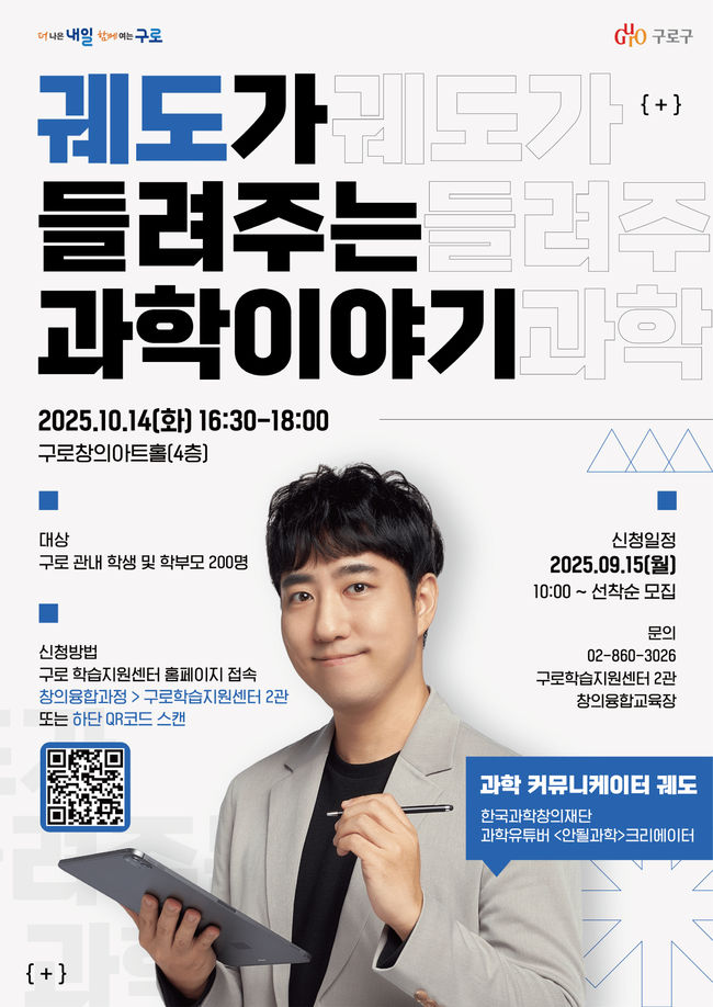 ‘궤도가 들려주는 과학 소통 강연회’는 10월 14일 오후 4시 30분 구로창의아트홀에서, ‘이세돌 사범이 전하는 미래의 힘 체험 및 강연회’는 11월 4일 오후 4시에 개최된다.