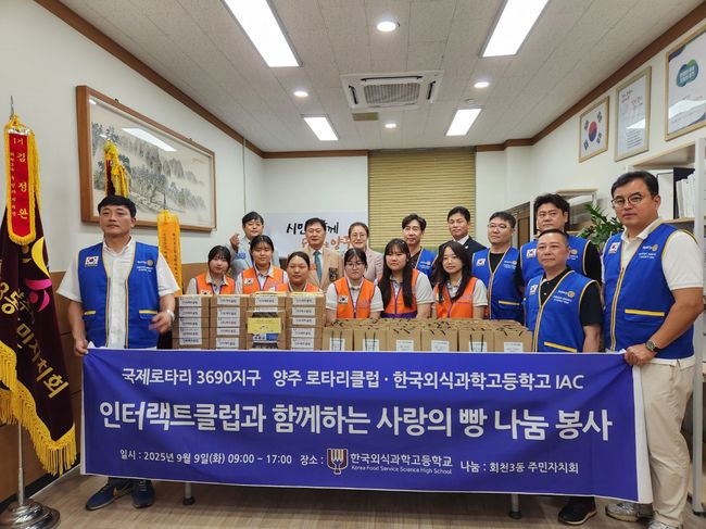 9일 진행된 이번 기부에는 학생들이 직접 구운 빵과 로타리클럽이 마련한 샴푸, 바디워시 등 생필품이 포함됐다. 기탁된 물품은 회천3동 저소득 독거노인 30가구에 전달될 예정이다.