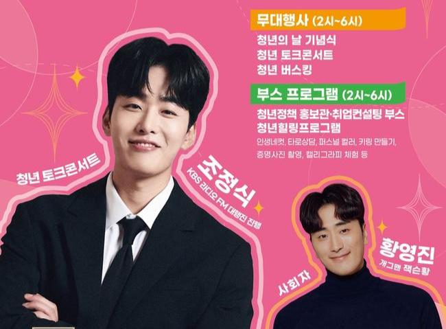 또한 개그맨 황영진이 진행하는 청년정책 퀴즈, 지난달 공연자 모집을 통해 최종 선정된 인천대 응원단 커플리온스, 댄스팀 키스카, 어쿠스틱 듀오 블루퍼피의 풋풋하면서도 열정 넘치는 공연도 준비돼 있다.