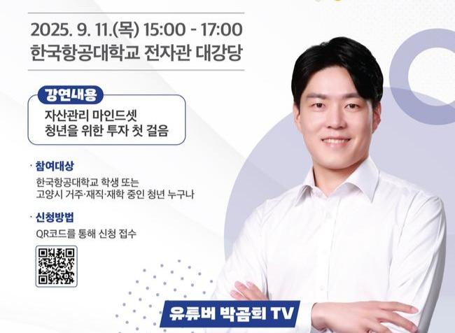 고양특례시(시장 이동환)가 오는 11일(목) 오후 3시 한국항공대학교 전자관 1층 대강당에서 86만 구독자를 보유한 금융 유튜버이자 베스트 셀러 작가인 '박곰희TV'를 초청해 명사특강'한번 배워서 평생 써먹는 자산관리 방법'을 개최한다고 밝혔다.