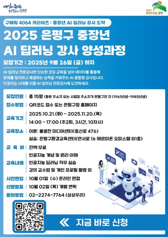 2025 은평구 중장년 AI 딥러닝 강사 양성과정 홍보 포스터.은평구는 40세에서 64세 중장년층을 대상으로 한 ‘구해줘 4064 커리어즈’ 프로그램을 통해 풍부한 경험과 역량에 디지털 및 인공지능(AI) 전문성을 더해 공공·민간 교육 현장에서 새로운 진로를 개척할 수 있도록 돕고 있다.