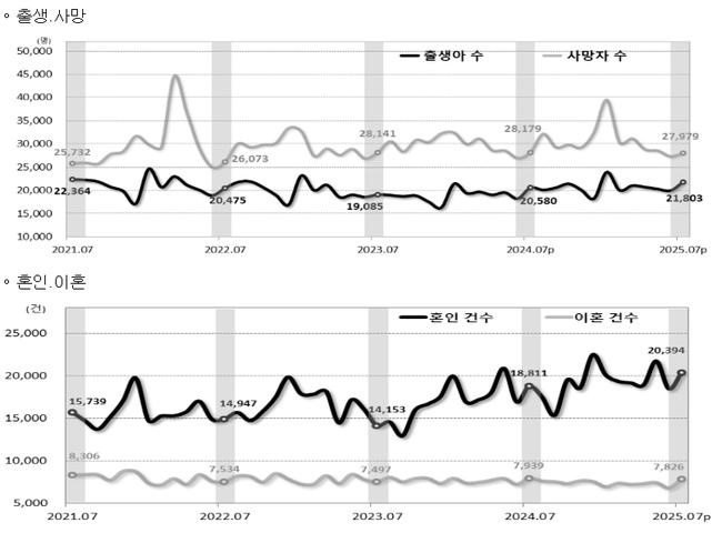 2025년 7월 인구동향에 따르면 출생아 수와 혼인 건수가 모두 증가했으나, 사망자 수가 출생아 수를 웃돌아 인구 자연감소 현상은 여전히 이어졌다.
