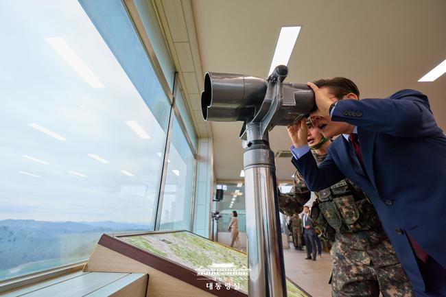 이날 대통령은 비무장지대(DMZ) 인근과 감시초소(GP) 상황을 보고받은 뒤, 최신식 병영 막사 공사 현장을 둘러보며 장병들이 보다 나은 환경에서 생활할 수 있도록 물 공급 등 세부 사항까지 꼼꼼히 확인했다.