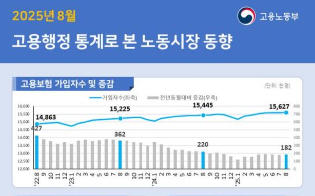 고용보험 상시가입자가 8월 기준 1,562만 7천명으로 집계되며 전년 같은 달보다 18만 2천명(1.2%) 증가했다. 증가 폭은 올해 4월부터 5개월 연속 18만명대를 이어가며 완만한 회복세를 보이고 있다.