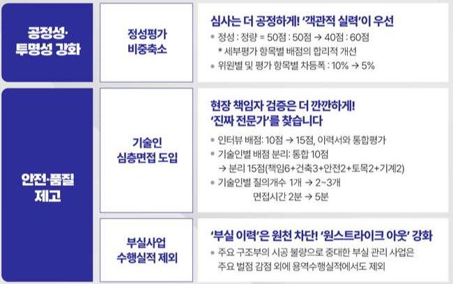 개정안은 크게 공정성·투명성 강화, 안전·품질 제고, 업체 부담 완화에 방점이 찍혔다. 우선 공정성을 높이기 위해 정성평가와 정량평가 비중을 기존 50 대 50에서 40 대 60으로 조정했다. 평가위원의 영향력을 줄이기 위해 평가 항목별 차등폭도 10%에서 5%로 축소했다.