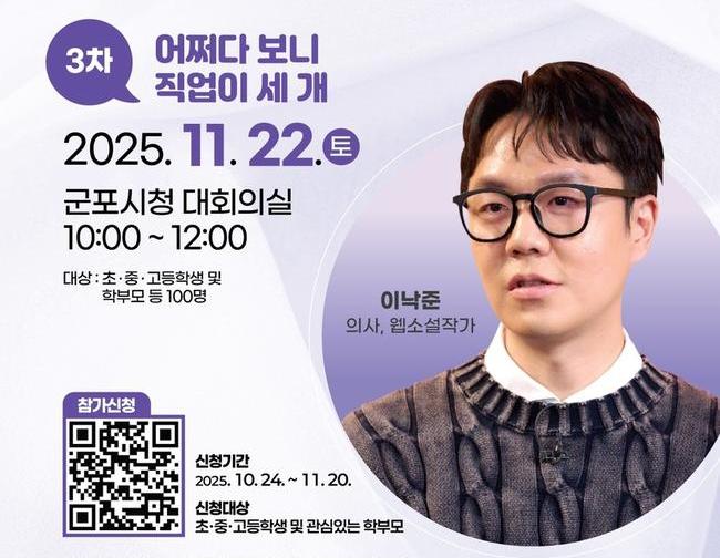 군포시(시장 하은호)는 청소년들이 자신의 꿈을 찾고 다양한 진로를 탐색할 수 있는 기회를 제공하고자 오는 11월 22일(토) 오전 10시 군포시청 대회의실에서 '청소년 꿈 멘토와 함께하는 토크콘서트(3차)'를 개최한다.