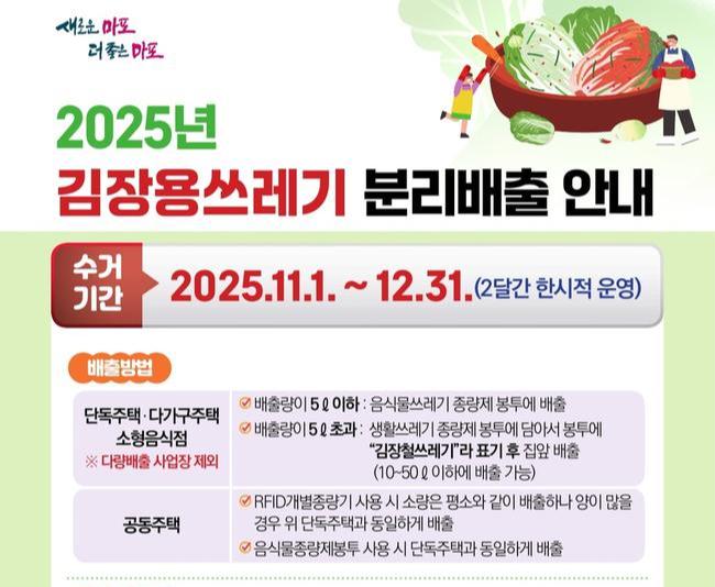 마포구(구청장 박강수)는 본격적인 김장철을 맞아 11월 1일부터 12월 31일까지 한시적으로 '김장용 쓰레기 특별 수거 기간'을 운영한다.
