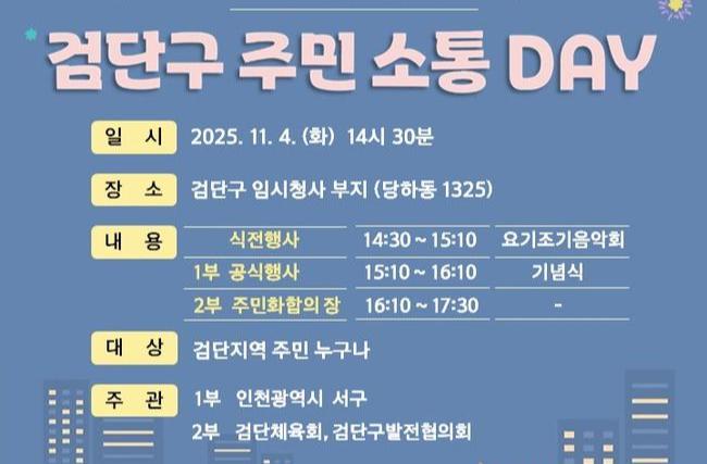 이번 행사는 검단지역 주민 누구나 자유롭게 참석 가능하며, 시민과 행정이 함께 소통하고 미래의 검단구를 함께 그려보는 의미 있는 자리가 될 전망이다.