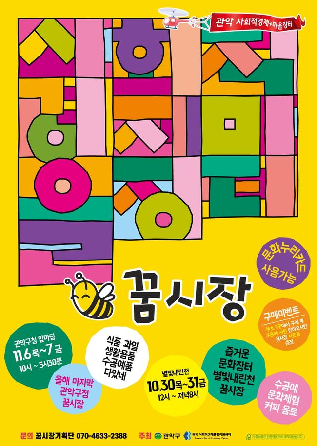 이어지는 11월 6일(수)과 7일(목)에는 10시부터 17시 30분까지 관악구청 앞마당에서 올해의 마지막 '꿈시장'이 운영된다.