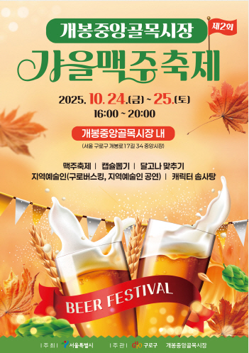 개봉중앙 골목형상점가 맥주축제 홍보 포스터.서울 구로구(구청장 장인홍)는 23일 지역 상권을 활성화하기 위한 ‘2025년 상권 이용촉진 이벤트 지원사업’을 본격 추진 중이라고 밝혔다.
