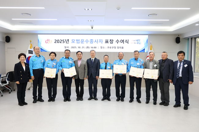 장인홍 구청장(왼쪽 여섯 번째)이 표창 대상자와 관계자들과 함께 기념사진을 찍고 있다.서울 구로구(구청장 장인홍)는 21일 구청 창의홀에서 ‘2025년 모범운수종사자 표창 수여식’을 개최했다고 밝혔다. 이번 표창은 지역 교통서비스 향상에 기여하고 모범적인 근무 태도를 보여온 운수종사자의 노고를 격려하기 위해 마련됐다.
