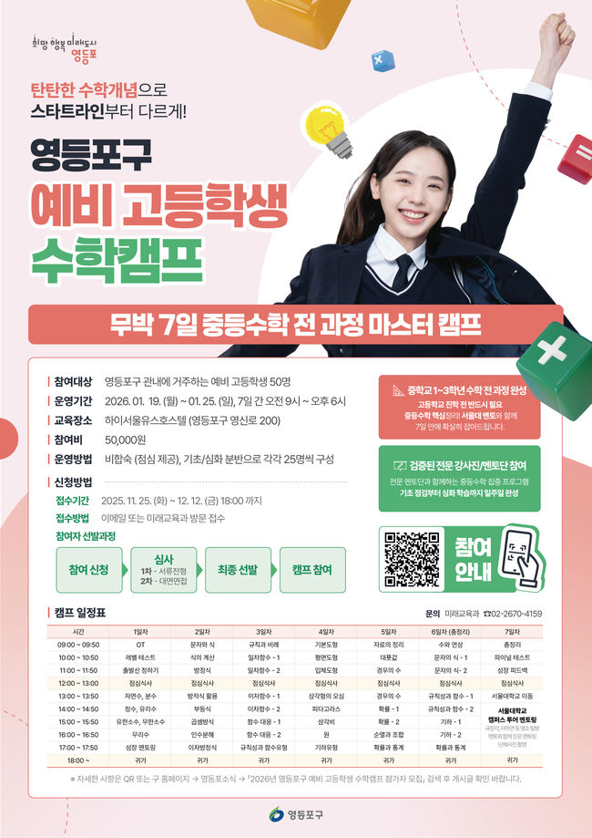 영등포구 '예비 고등학생 수학캠프' 홍보 포스터.서울 영등포구(구청장 최호권)는 고등학교 진학을 앞둔 관내 중학생을 대상으로 ‘예비 고등학생 수학캠프’를 운영하며 12월 12일까지 참가자 50명을 모집한다고 밝혔다.