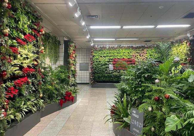 이번 크리스마스를 맞아 두 역사의 '서울 아래숲길' 전 구간을 금빛 장식 공과 벨벳 리본 등으로 꾸미고, 겨울을 상징하는 빨간 포인세티아 꽃을 곳곳에 배치했다.