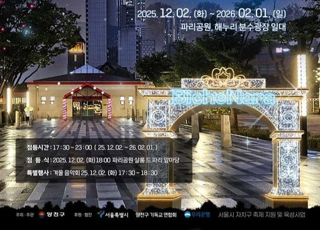 양천구(구청장 이기재)는 연말연시를 맞아 구민에게 따뜻한 감성과 환상적인 볼거리를 선사하기 위해 11월 28일부터 2026년 2월 1일까지 파리공원과 해누리분수광장에서 '2025 양천 비체나라 페스티벌'을 개최한다고 밝혔다.