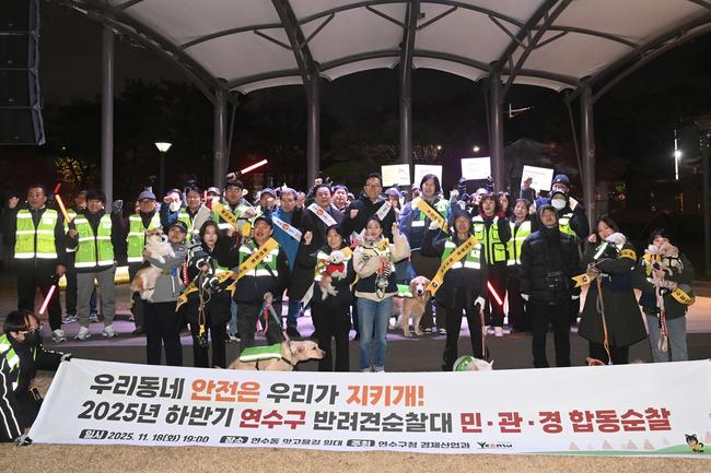 연수구(구청장 이재호)는 지난 18일 반려견 순찰대(일명 연수지킴댕댕이), 연수2동·동춘3동 자율방범대, 인천경찰청 기동순찰대 등 50여 명이 참여한 '민·관·경 야간 합동 순찰'을 진행했다.