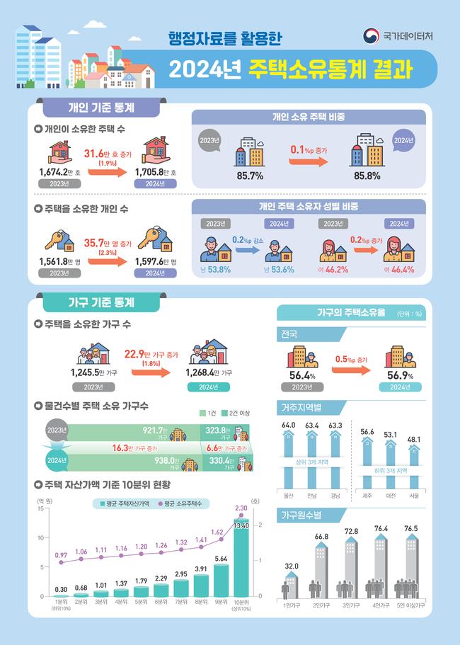 주택을 소유한 개인은 1,597만6천 명으로 전년 대비 35만7천 명 늘었다. 성별 비중에서는 남성이 53.6%, 여성이 46.4%로, 여성 소유자 비율이 4년째 상승했다.