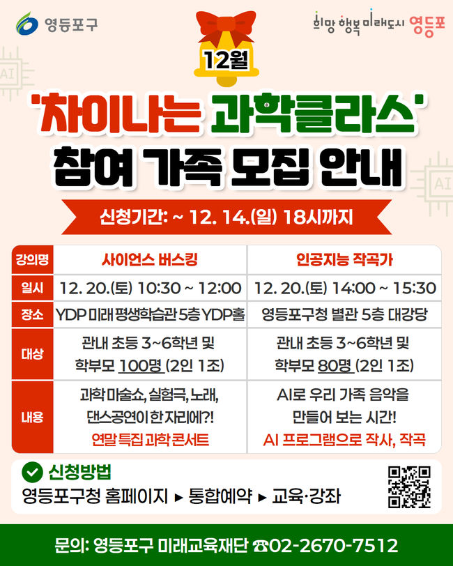 12월 차이나는 과학클라스 모집 홍보 포스터.10일 서울 영등포구(구청장 최호권) 산하 영등포구 미래교육재단은 연말을 맞아 온 가족이 함께 참여하는 과학문화 특별프로그램 ‘차이나는 과학클라스’ 참가자를 모집한다고 밝혔다. 이번 프로그램은 오는 12월 20일 운영되며 학부모와 자녀가 공연과 체험을 함께 경험할 수 있도록 기획됐다.