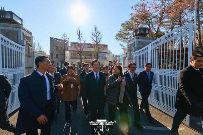 식사를 마친 뒤 이 대통령은 인근 총리 공관까지 도보로 이동하며 시민들에게 '새해 복 많이 받으시라'고 인사를 건네고 사진 촬영 요청에 일일이 응했다. 이어 총리 공관 내 한옥 삼청당에서 기자들과 차담을 가졌다.