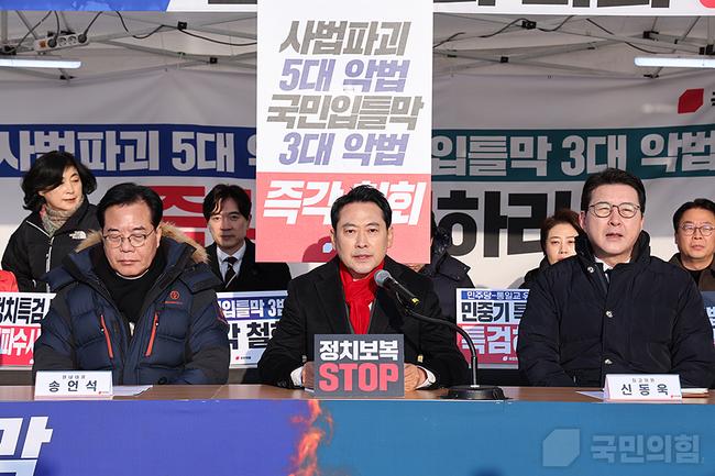 장동혁 국민의힘 당대표는 15일 서울 여의도 국회 본관 앞 ‘8대 악법 저지’ 릴레이 천막농성장에서 열린 최고위원회의에서 이재명 대통령의 최근 발언을 두고 “대통령의 말이 불안하면 국민의 삶도 불안해진다”며 권력 남용과 사회 질서 훼손을 강하게 비판했다.