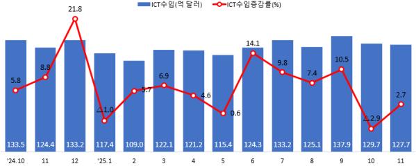 수출은 글로벌 ICT 기기 수요 회복세 속에 10개월 연속 증가세를 이어갔다. 11월 ICT 수출은 254.5억 달러로 역대 1위 실적을 기록했으며, 9월(254.0억 달러)과 10월(233.0억 달러)에 이어 높은 흐름을 유지했다.
