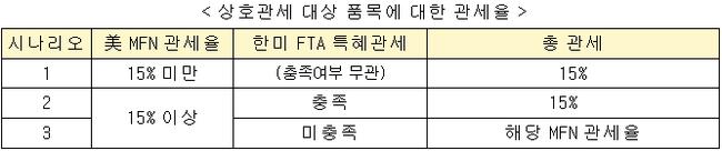 상호관세 부과 품목은 8월 7일부터 MFN 관세율에 15%가 추가되고 있었으나, 이번 조정에 따라 15% 미만 MFN 품목은 총 15% 관세만, MFN 15% 이상 품목도 한미 FTA 충족 시 동일하게 15%만 적용된다. FTA 요건을 충족하지 못한 경우에는 기존 MFN 관세율이 유지된다.