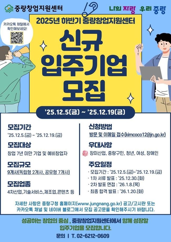 중랑구, 2025년 하반기 중랑창업지원센터 신규 입주기업 모집.중랑구(구청장 류경기)는 중랑창업지원센터 신규 입주기업을 오는 12월 19일까지 모집한다고 밝혔다.