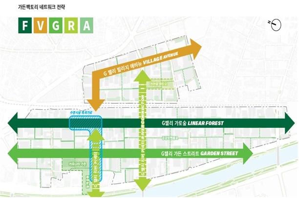G밸리 가든팩토리의 총면적은 187,364㎡로, 공개공지 135개소, 가로수 2,227주, 띠녹지 4,527㎡ 등을 포함해 연속적인 녹지축을 형성하는데 중점을 두고 있다. G밸리 내 다양한 녹지공간을 단순히 잇는 것이 아니라 미세먼지와 도로변 소음을 차단할 수 있는 '녹지축'을 형성하는 데에도 주력한다.