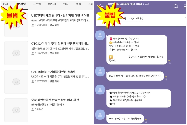 불법 행위 유형도 다양하게 나타나고 있다. 텔레그램·오픈채팅방을 통한 익명 스테이블 코인 교환, 미신고 해외 플랫폼 홍보 및 레퍼럴 알선, 환전소를 매개로 한 무등록 환치기 등이 대표 사례로 꼽힌다. FIU와 관세청은 환치기 업자가 해외 공모자로부터 테더(USDT)를 수령해 국내 거래소에서 현금화한 뒤 국내 수령인에게 송금하는 방식의 불법 운영을 적발한 바 있다. 이러한 거래는 특정금융정보법뿐 아니라 외국환거래법 위반 소지도 크다.