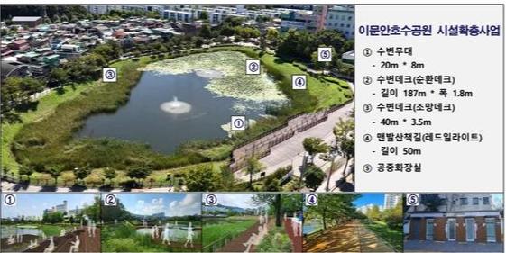 이번 사업은 이문안호수공원의 수변 공간을 중심으로 수변무대와 수변나무 바닥(데크), 맨발 산책길, 공중화장실 등 주민 설문조사를 통해 이용 수요가 높은 시설을 조성하고, 건강·여가·문화 기능을 동시에 강화하는 데 목적을 두고 있다.