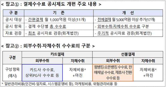 금융위원회와 금융감독원은 '전자금융업자 수수료 구분관리 및 공시 등을 위한 가이드라인'금감원 행정지도)을 개정(’25.11.26.)하고, 업계의 사전 준비 및 개편된 제도의 조기 시행을 위해 ’25.8~10월 기간 중 결제수수료율을 시범적으로 공시키로 하였다.