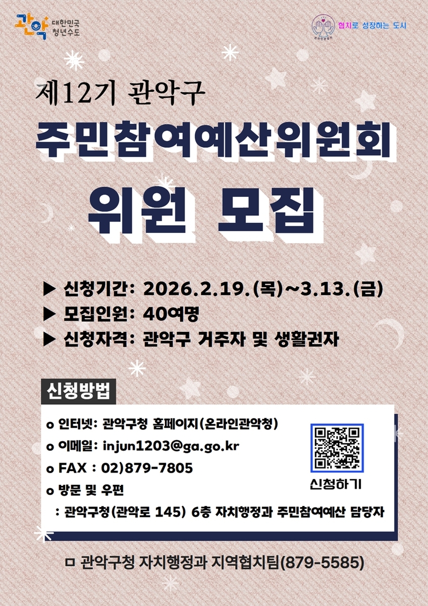 자세한 사항은 관악구청 홈페이지(고시공고→제12기 관악구 주민참여예산위원회 위원 모집)를 참고하거나 관악구 자치행정과 지역협치팀(02-879-5585)으로 문의하면 된다.