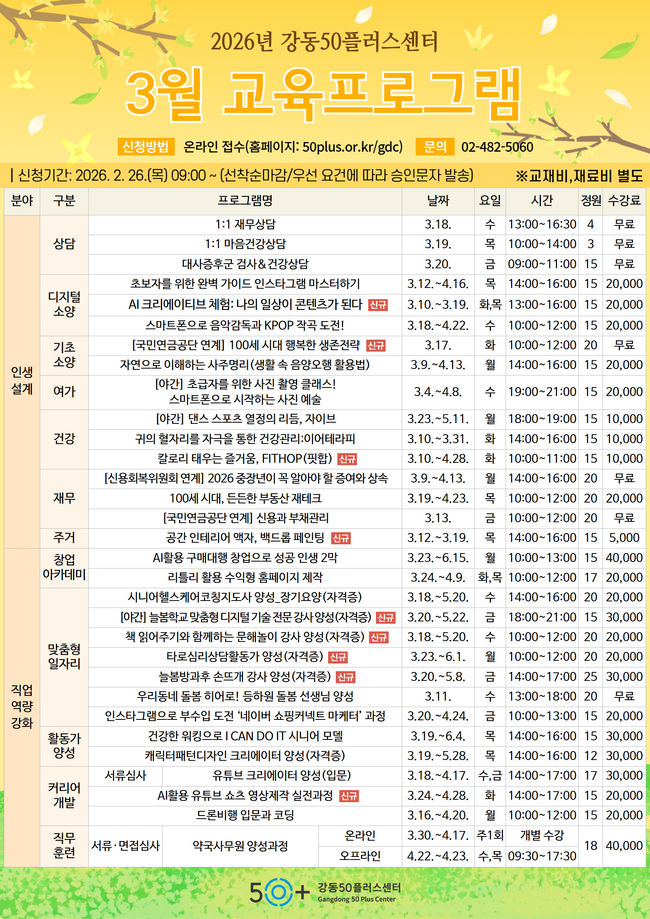 강동50플러스센터 3월교육 프로그램 안내.서울특별시 강동구는 2월 26일부터 강동50플러스센터 3월 교육 프로그램 수강생 모집을 시작한다. 모집 인원은 총 496명이다. 강좌는 31개다. 신청은 센터 누리집에서 진행한다. 40~64세 강동구민을 우선 선발한다.