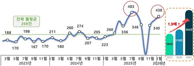 최근 3년간(2023.2.~2026.1.) 월평균 민원 추이 (국가정보자원관리원 화재로 인한 국민신문고 시스템 등 운영 중단<25.9.26.~10.27.>)