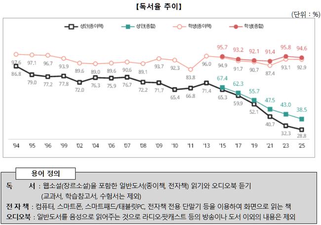 2025년 국민 독서실태 조사에서 학생 독서율은 94.6%를 기록한 반면 성인 독서율은 38.5%로 감소하며 세대 간 독서 격차가 뚜렷하게 나타났다.