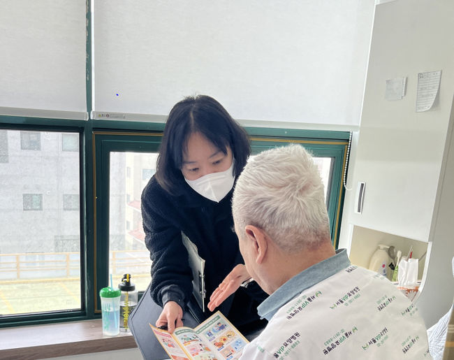 의료급여 사례관리자가 입원 중인 수급자에게 맞춤형 복지 서비스를 안내하고 있다.구로구는 이달부터 의료급여 수급자의 장기입원 실태를 파악하고 의료 이용 행태를 점검하는 ‘의료급여 장기입원자 실태조사’를 실시한다고 9일 밝혔다. 조사 대상은 관내·외 18개 의료기관에 입원 중인 의료급여 수급자 178명이다.