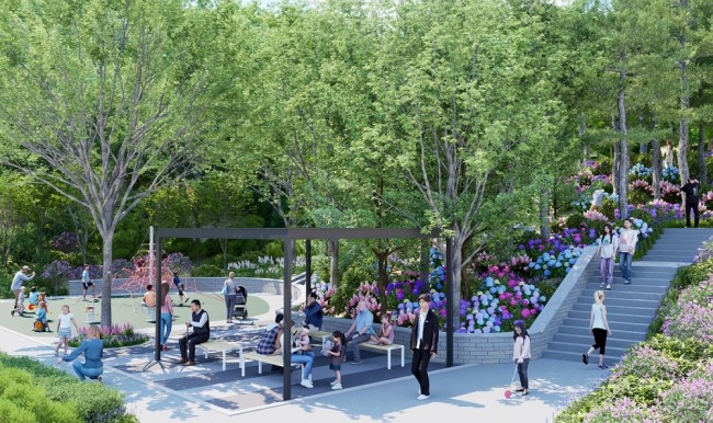 아울러 아이부터 어르신까지 다양한 계층의 이용을 고려한 맞춤형 공간 구성에 중점을 뒀다. 특히 ▲짙은 녹음과 맑은 공기를 즐길 수 있는 쉼터 '풍경마루'와 '힐링마당' ▲야외 운동기구가 있는 '활력마당'과 '건강마당' ▲다양한 여가 활동을 즐길 수 있는 다목적 '잔디마당' ▲자연 속 어린이 놀이시설을 갖춘 '놀이마당' ▲계절별 초화류가 있는 테마정원과 수국원 등을 조성해 주민들이 다채로운 여가와 휴식 환경을 누릴 것으로 구는 기대한다.