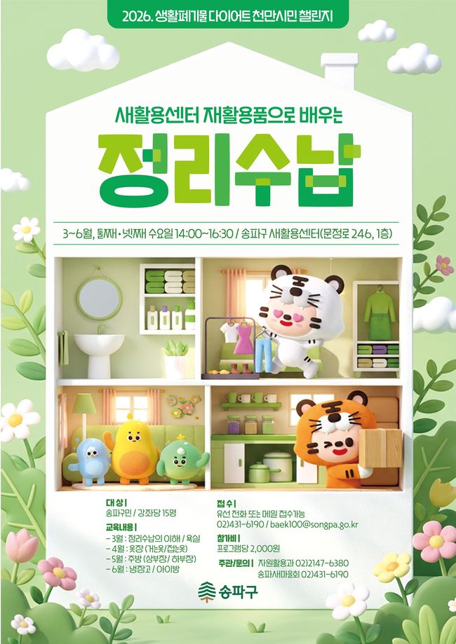 서강석 송파구청장은 “재활용과 정리를 접목해 주민들이 일상에서 환경 보호를 실천할 수 있도록 마련한 교육”이라며 “체감할 수 있는 환경 정책을 지속적으로 추진하겠다”고 말했다.