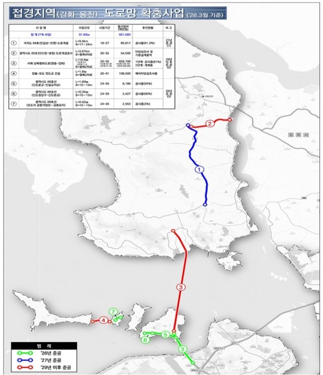 둘째, 강화·옹진에서도 변화가 본격화된다. 서해 남북평화도로와 국지도84호선(길상∼선원) 등 총 7개 사업이 추진되며, 총연장 31.93㎞, 사업비는 약 9,217억 원 규모다.