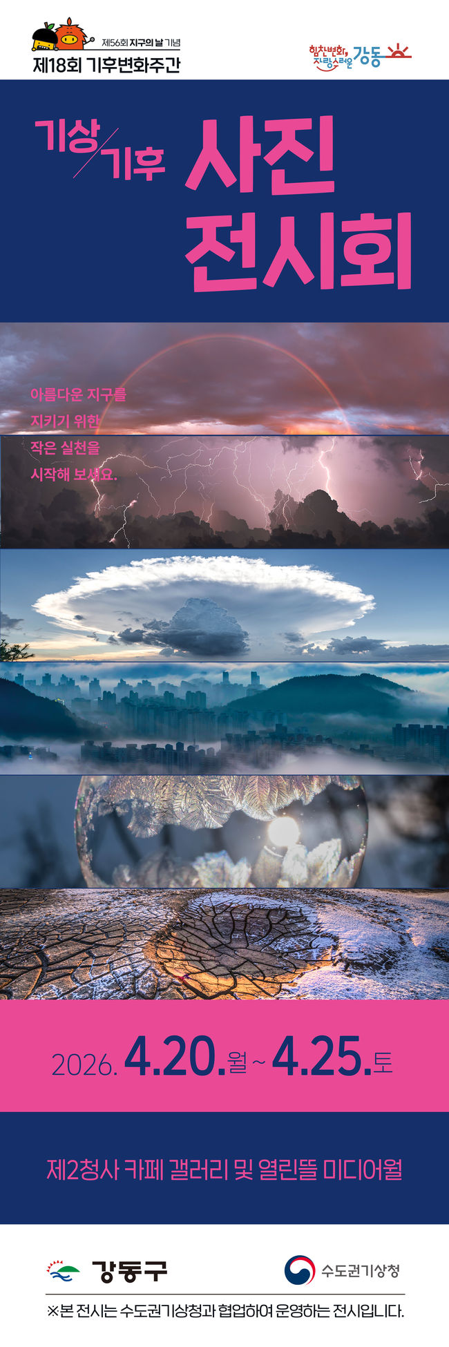 기상 기후 사진전.행사는 탄소중립 실천 문화를 일상으로 끌어들이기 위해 참여형 프로그램 위주로 꾸려졌다. 20일부터 25일까지는 강동구청 제2청사 카페와 열린뜰 미디어월에서 '기상·기후 사진 전시회'가 열린다. 기상청 공모전 수상작 등 다양한 작품을 통해 기후변화의 현실을 시각적으로 전달한다.