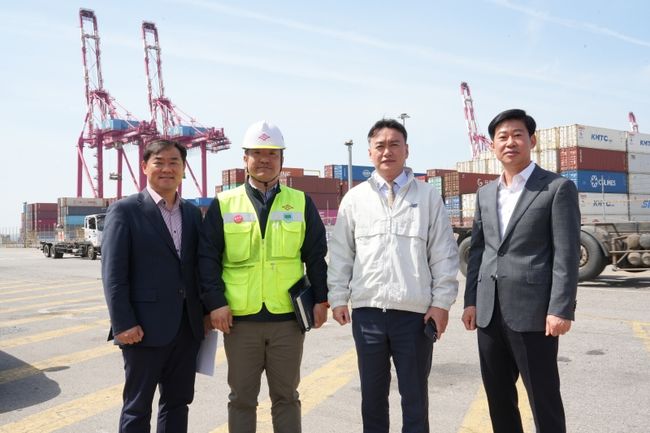 이종욱 관세청 차장(오른쪽 두번째)이 16일 인천신항 선광컨테이너 터미널을 방문하여 통관 현장을 점검한 뒤 기념 촬영하고 있다.