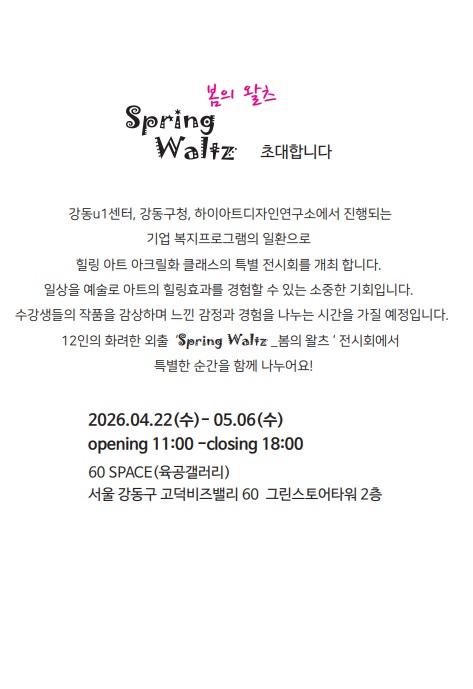 서울 강동구가 고덕비즈밸리 입주기업과 협력해 주민 미술 교육 수강생의 작품 전시회 '봄의 왈츠'를 4월 22일부터 5월 6일까지 '60 SPACE'(고덕비즈밸리로 60, 2층)에서 개최한다.