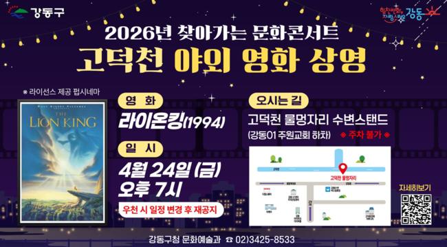 상영작은 디즈니 애니메이션 '라이온킹(1994)'이다. 세대를 아우르는 명작으로 가족 단위 관람객은 물론 다양한 연령층이 함께 즐길 수 있다. 사전 신청 없이 당일 현장을 방문하면 누구나 무료로 관람할 수 있다.