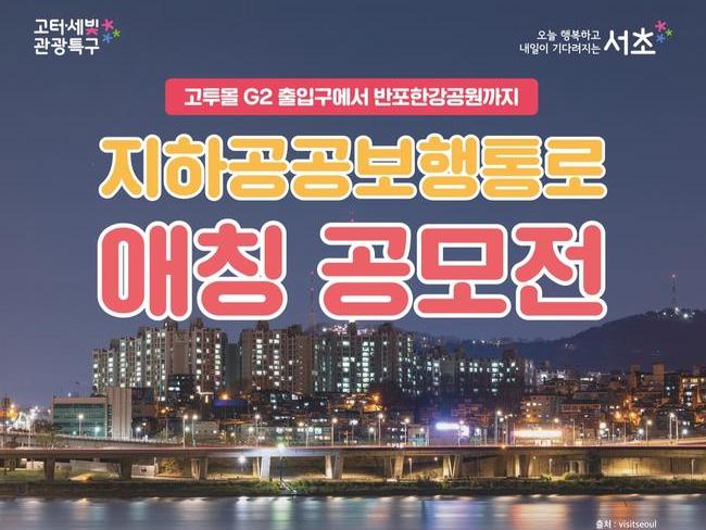 서울 서초구(구청장 전성수)는 10월 9일까지 고터·세빛 관광특구 내 위치해 고투몰과 반포한강공원을 잇는 지하 공공보행통로 애칭 공모전을 개최한다고 밝혔다.