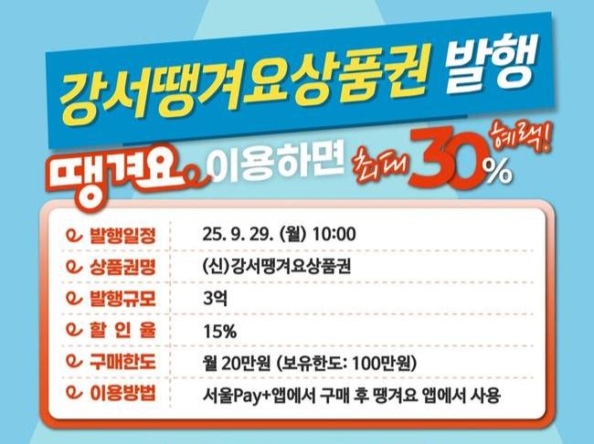 서울 강서구(구청장 진교훈)는 오는 29일 공공배달앱 '땡겨요'에서 사용가능한 상품권 총 3억 원을 발행한다.